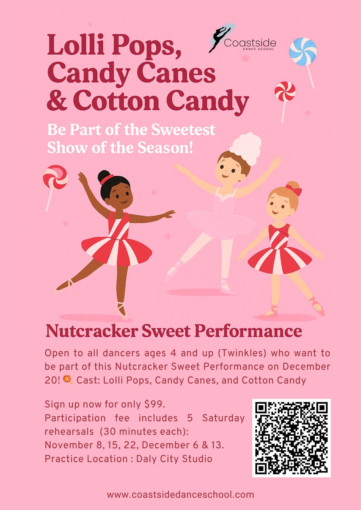 Our Nutcracker Sweet Performance is a delightful Holiday Show for all Ballet and Ballet Combo classes (school-aged) — plus a special invitation for our Twinkles (ages 4+) who want to join the fun!